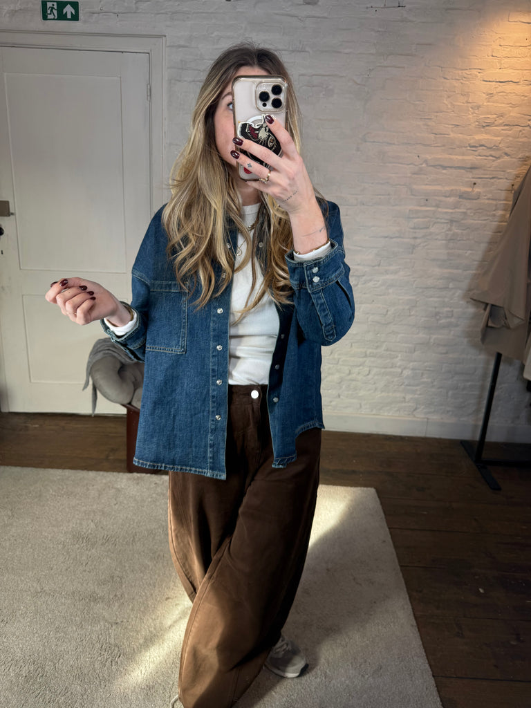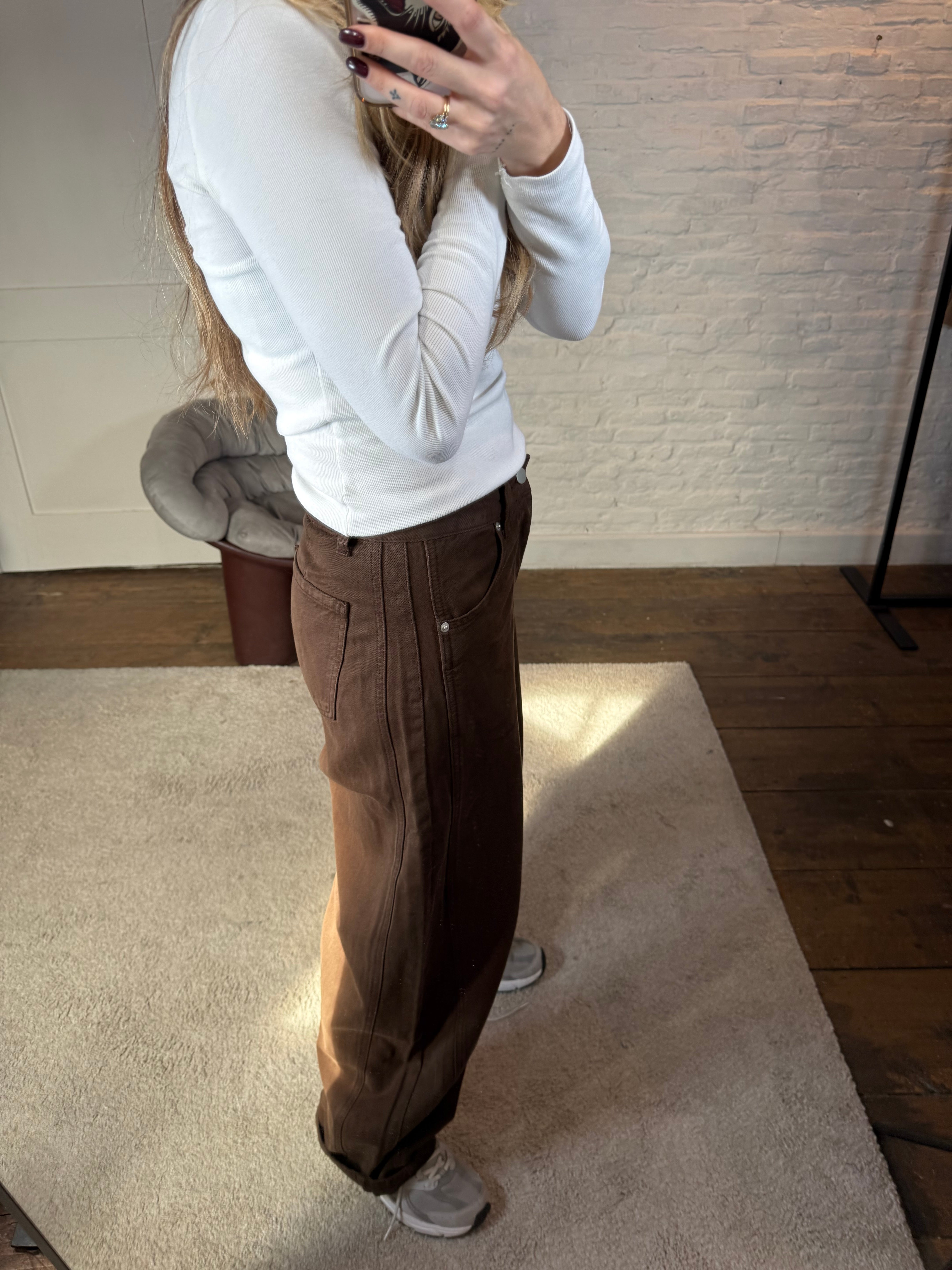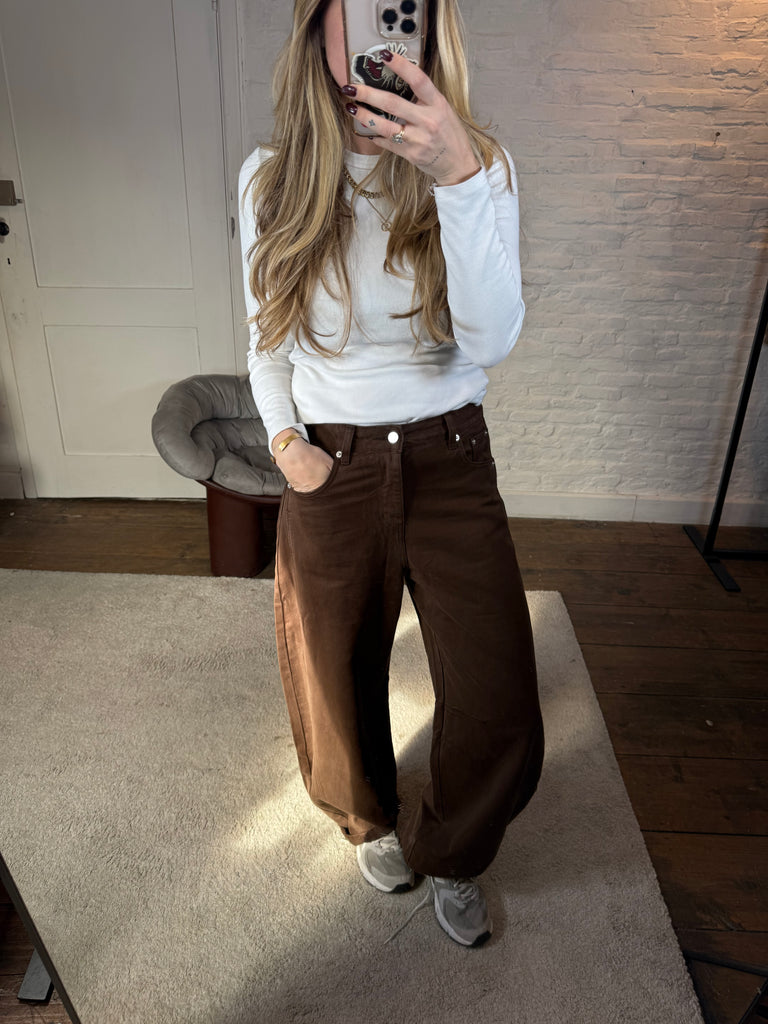 Trendy en comfy tegelijk! Deze barrel fit jeans in 100% katoen heeft die typische ronde, relaxte pasvorm en valt mooi op maat. Verkrijgbaar in maatjes XS t.e.m. L – ik draag hier de M en die zit perfect.