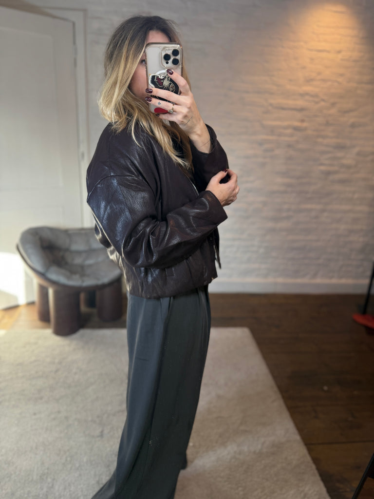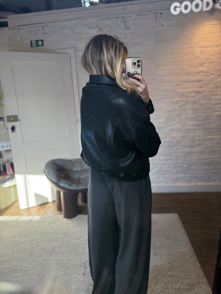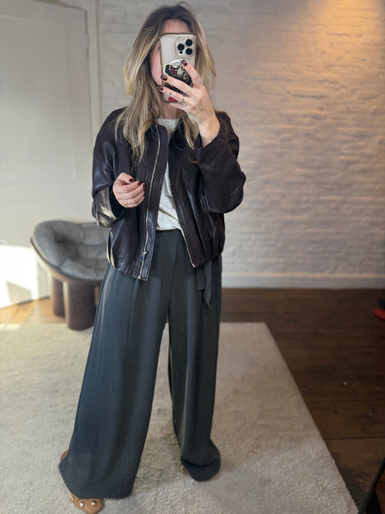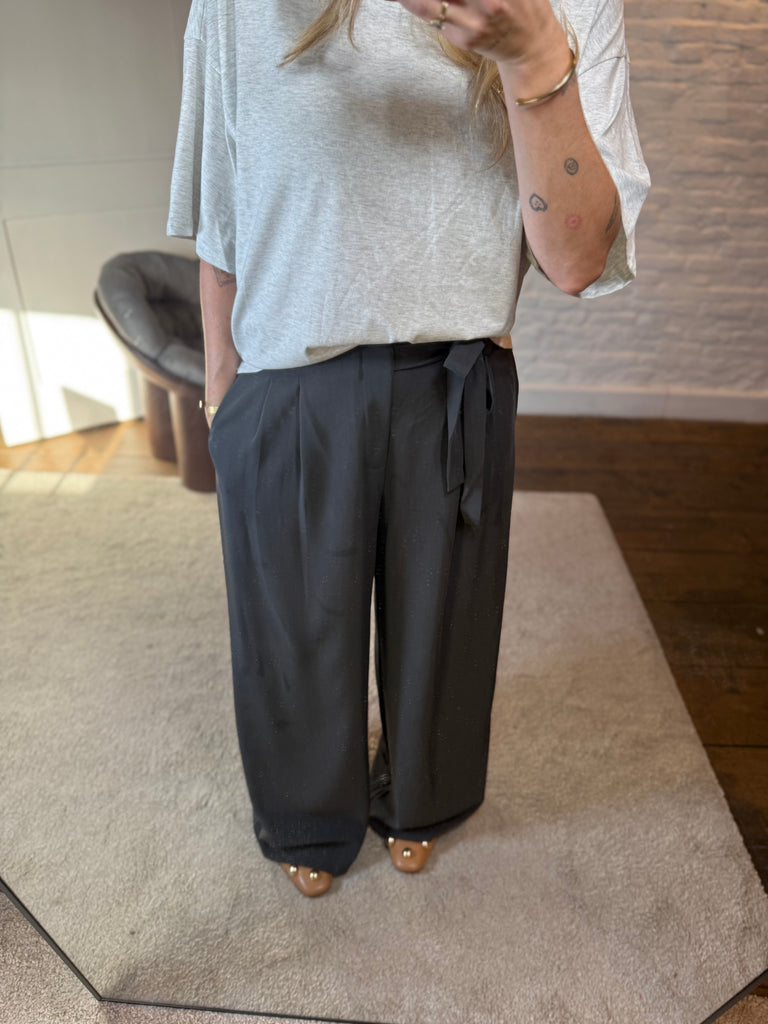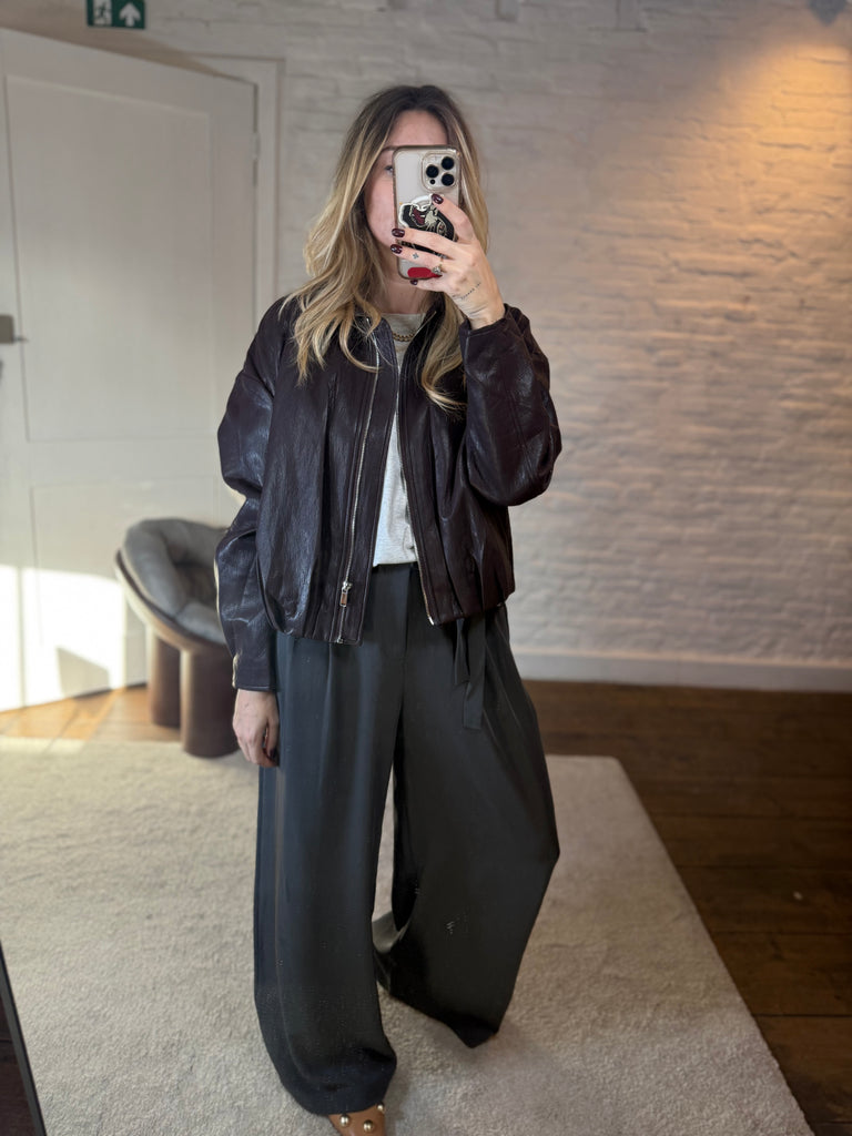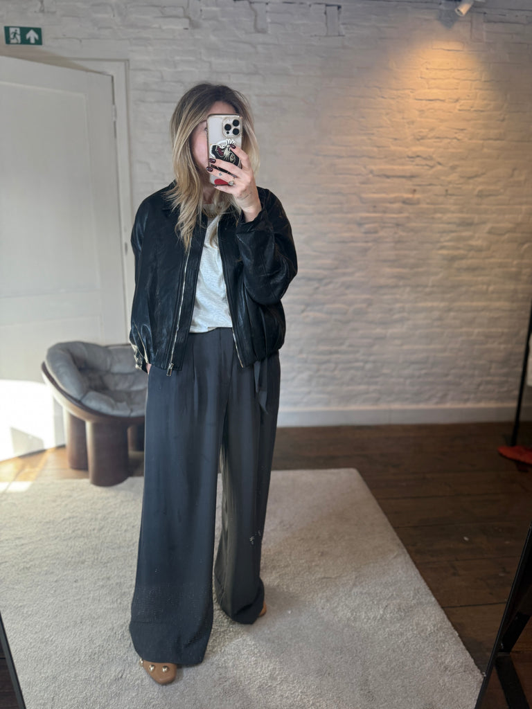 De broek heeft een ritssluiting aan de zijkant en een elegant strikdetail dat je taille extra in de verf zet. Verkrijgbaar in XS t.e.m. L. Zelf ben ik 1m68, draag normaal maat M, en draag hier ook een M voor een comfortabele, flatterende fit.