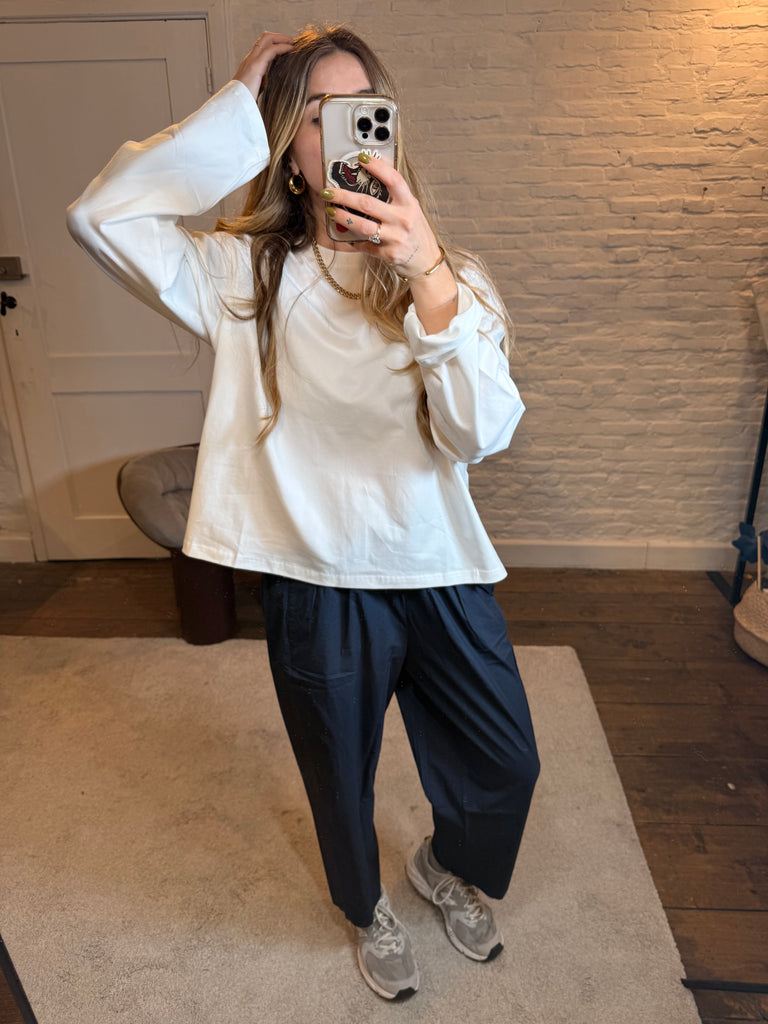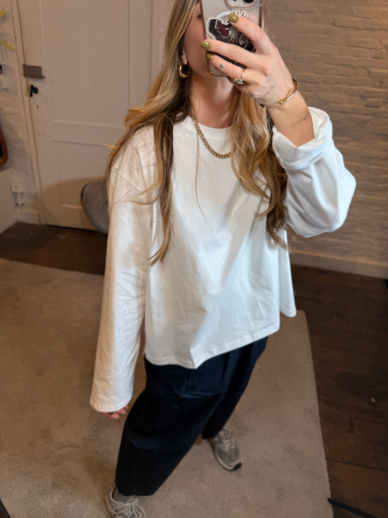 Heerlijk comfy en on trend! Deze longsleeve heeft een losse, relaxte fit en voelt superzacht aan. Gemaakt van 95% katoen en 5% elastaan – ademend, soepel en ideaal voor elke dag. Verkrijgbaar in maatjes S/M en M/L – ik draag hier de S/M.