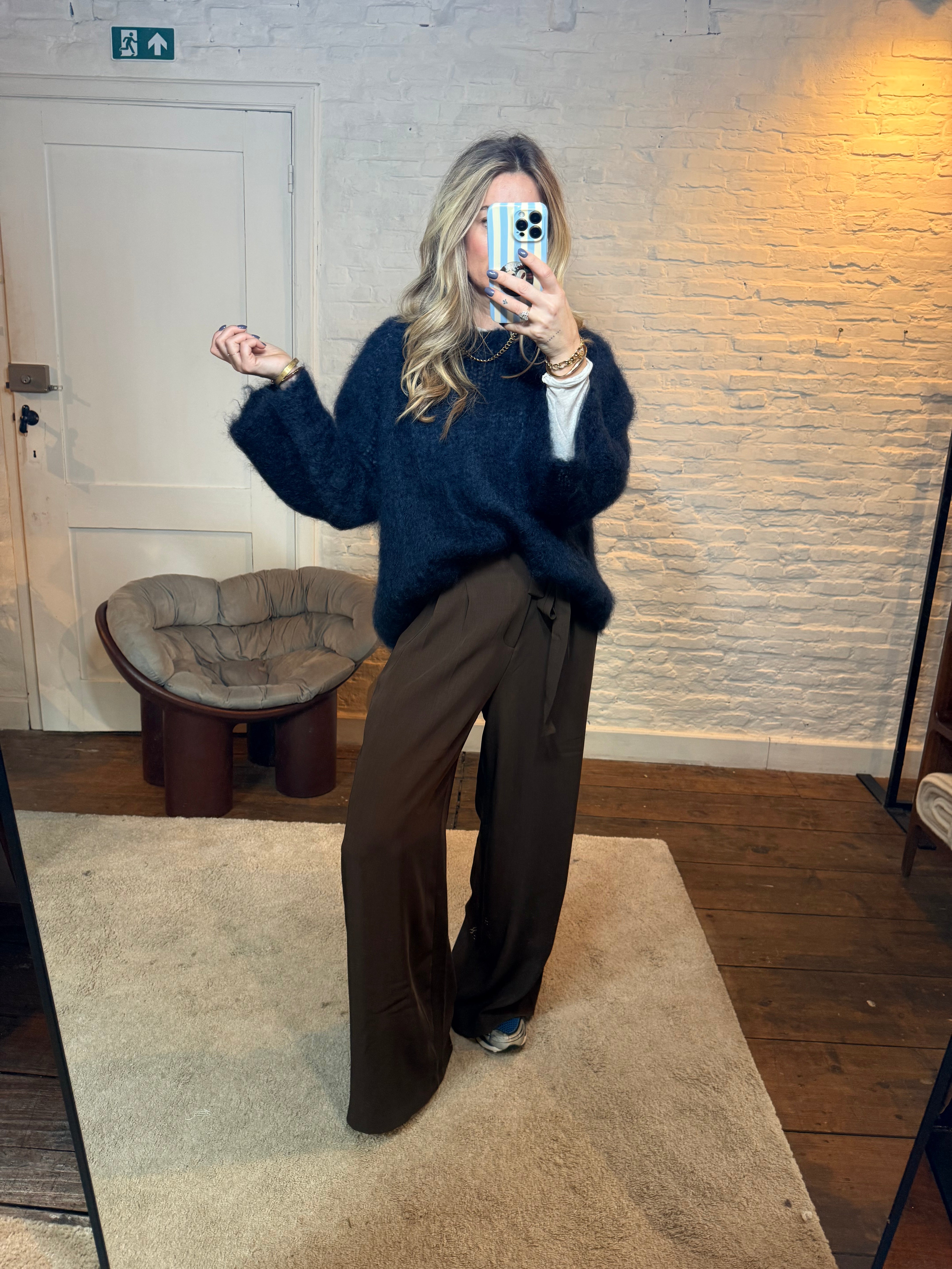De wijd uitlopende mouw geeft de trui een elegante, moderne uitstraling – een subtiele eyecatcher die elke outfit net dat tikkeltje specialer maakt. De fit is comfortabel en valt mooi soepel rond het lichaam.