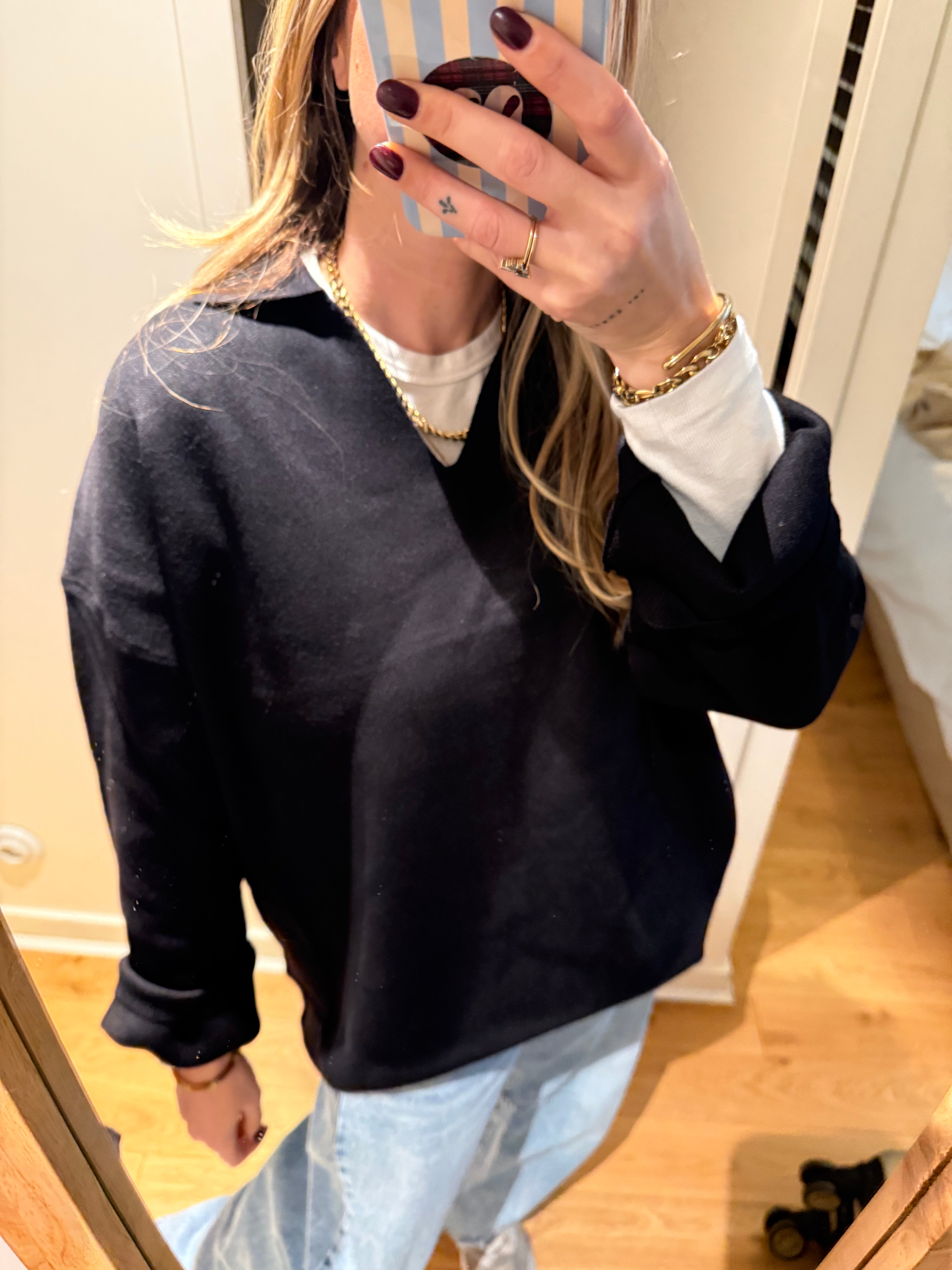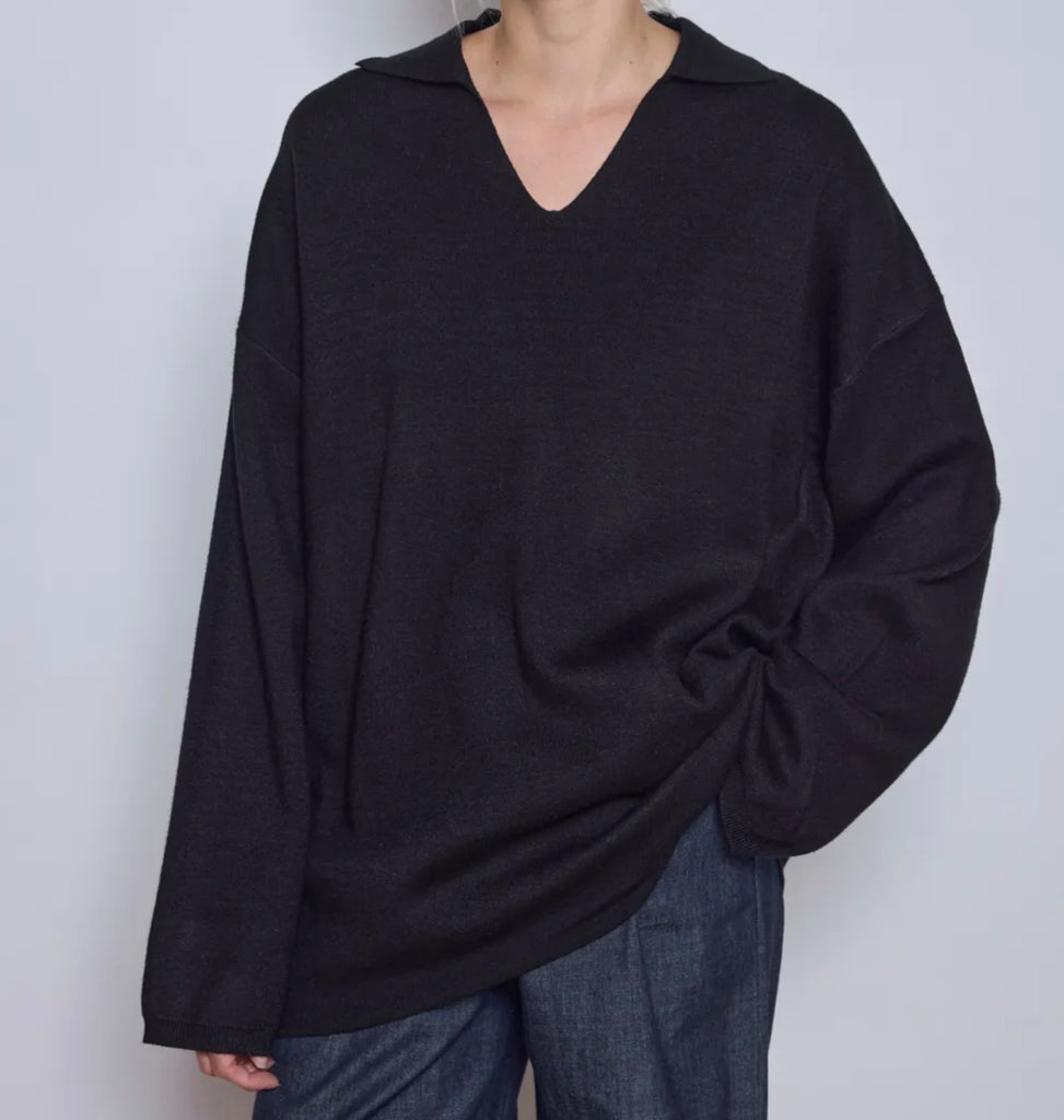 Trui met polokraag en V-hals, met lange mouwen voor een tijdloze, casual look. De rechte snit en verlaagde schouders zorgen voor een ontspannen silhouet, terwijl de soepele, zachte stof heerlijk comfortabel aanvoelt. Standaard lengte met nette afwerking.