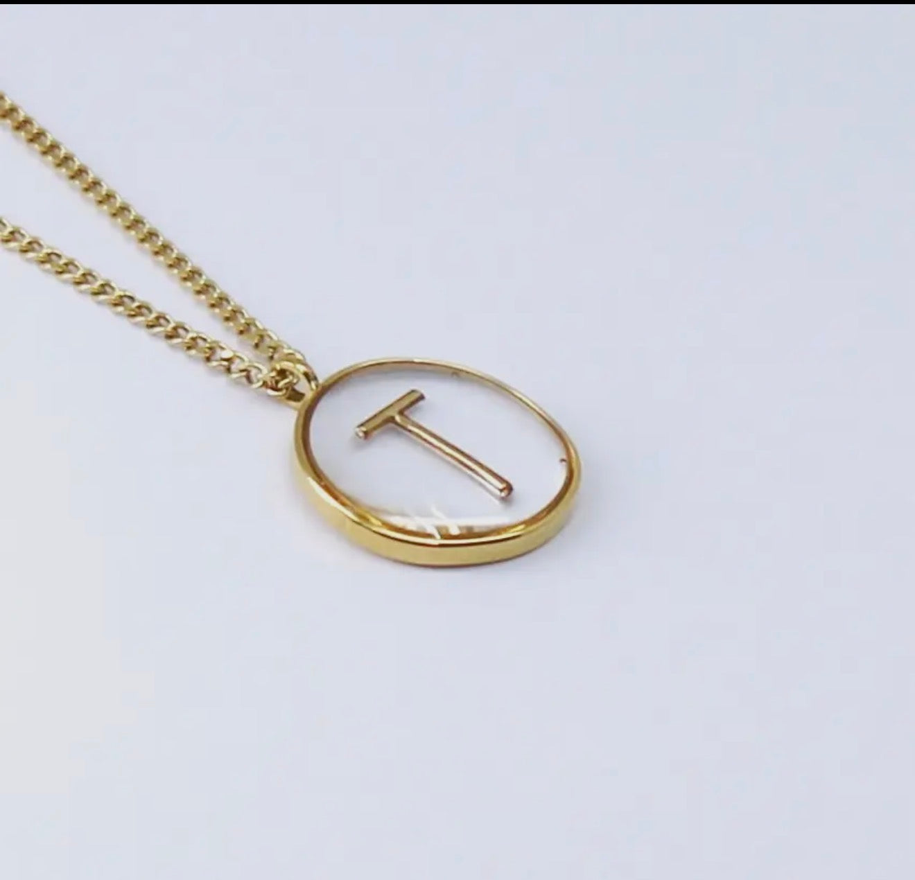 Verstelbare halsketting van goudstaal van 50 cm lang + 5 cm lang met een ronde hanger van transparant hars en een beginletter in het midden Materiaal: goudkleurig roestvrij staal