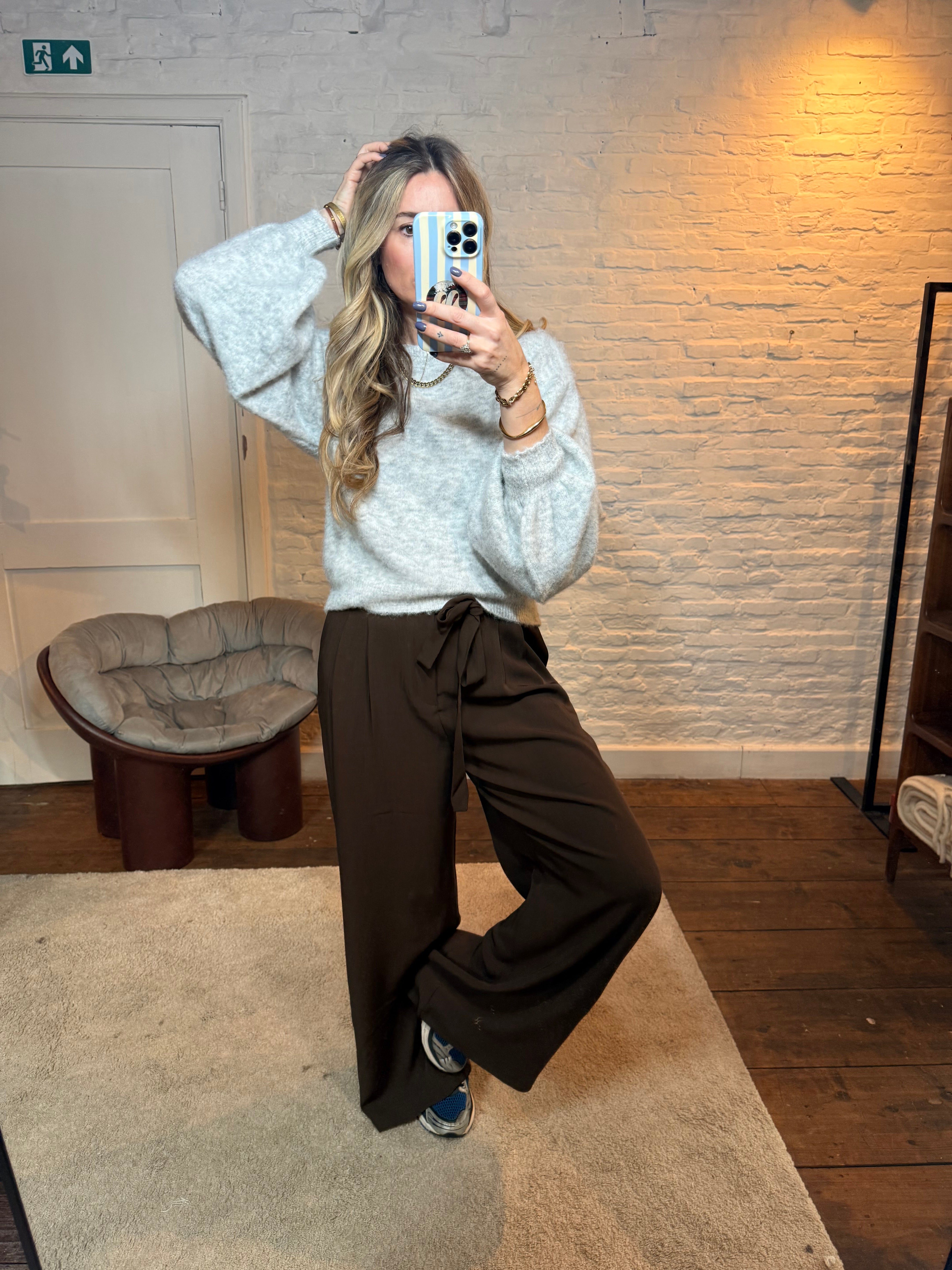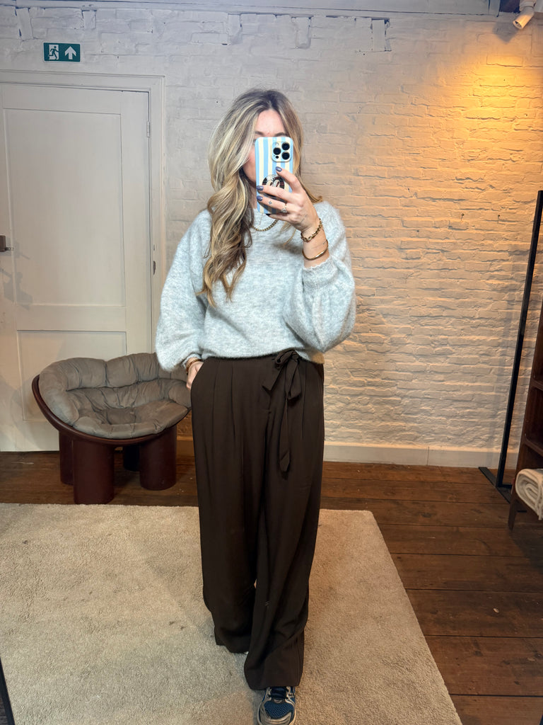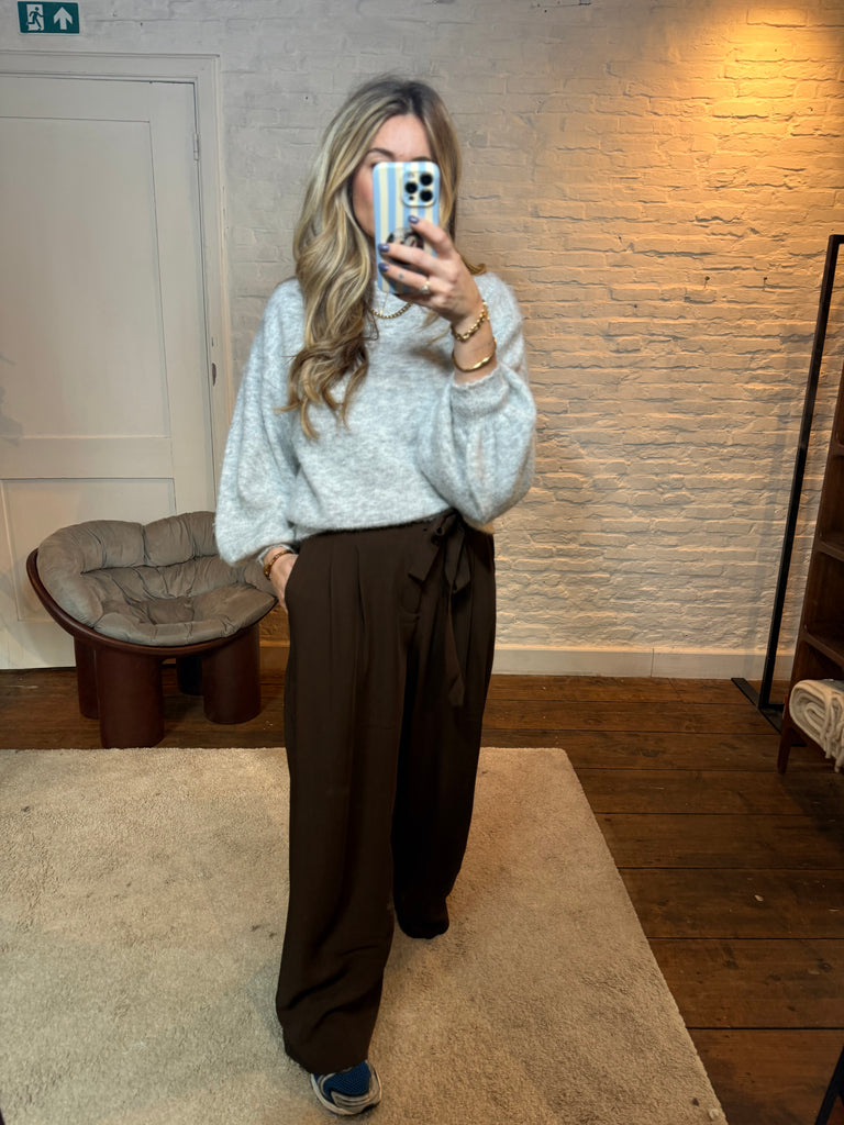 De broek heeft een ritssluiting aan de zijkant en een elegant strikdetail dat je taille extra in de verf zet. Verkrijgbaar in XS t.e.m. L. Zelf ben ik 1m68, draag normaal maat M, en draag hier ook een M voor een comfortabele, flatterende fit.