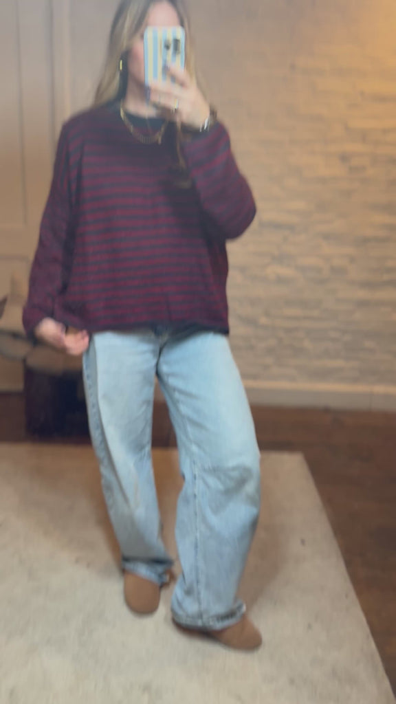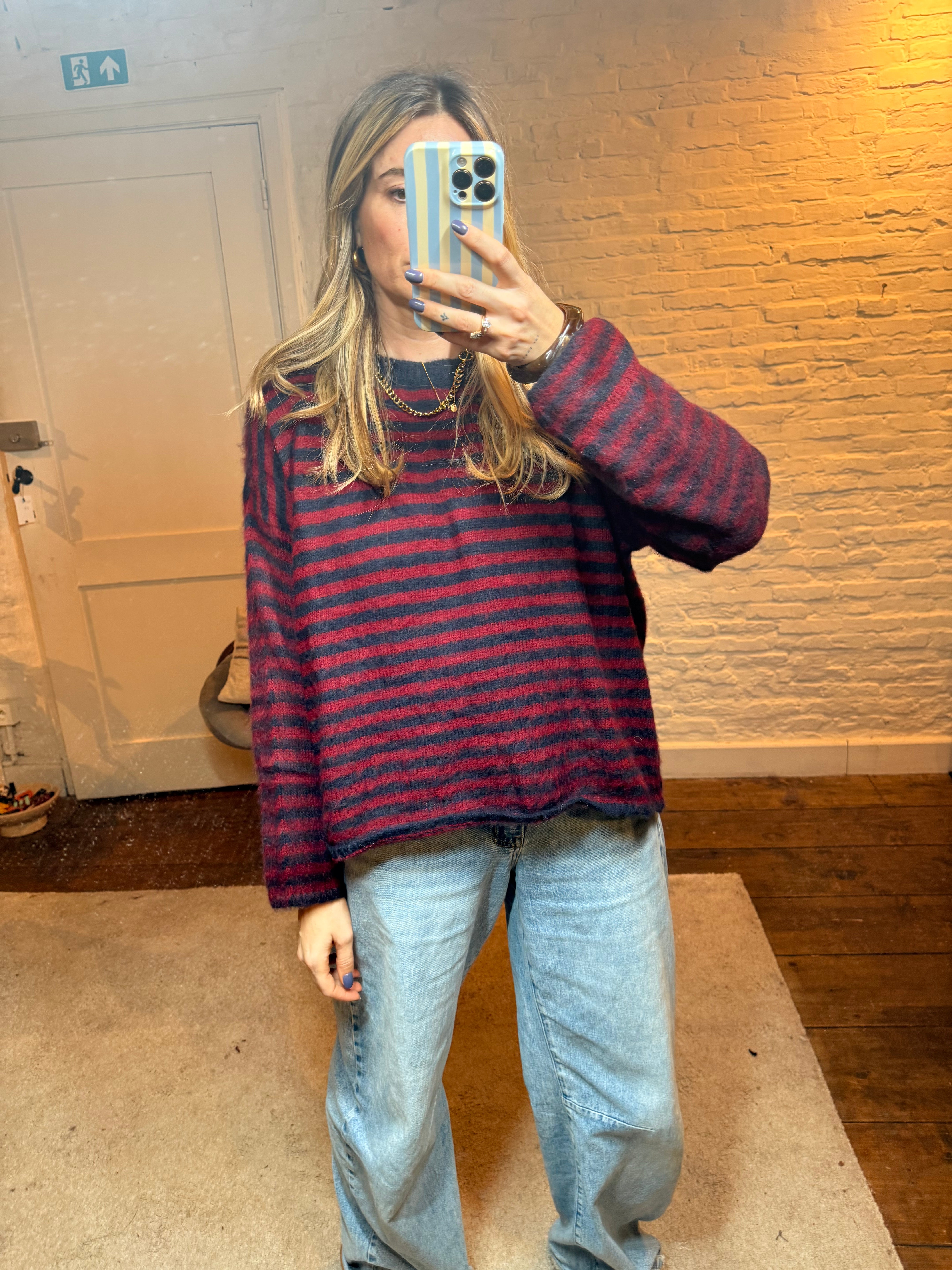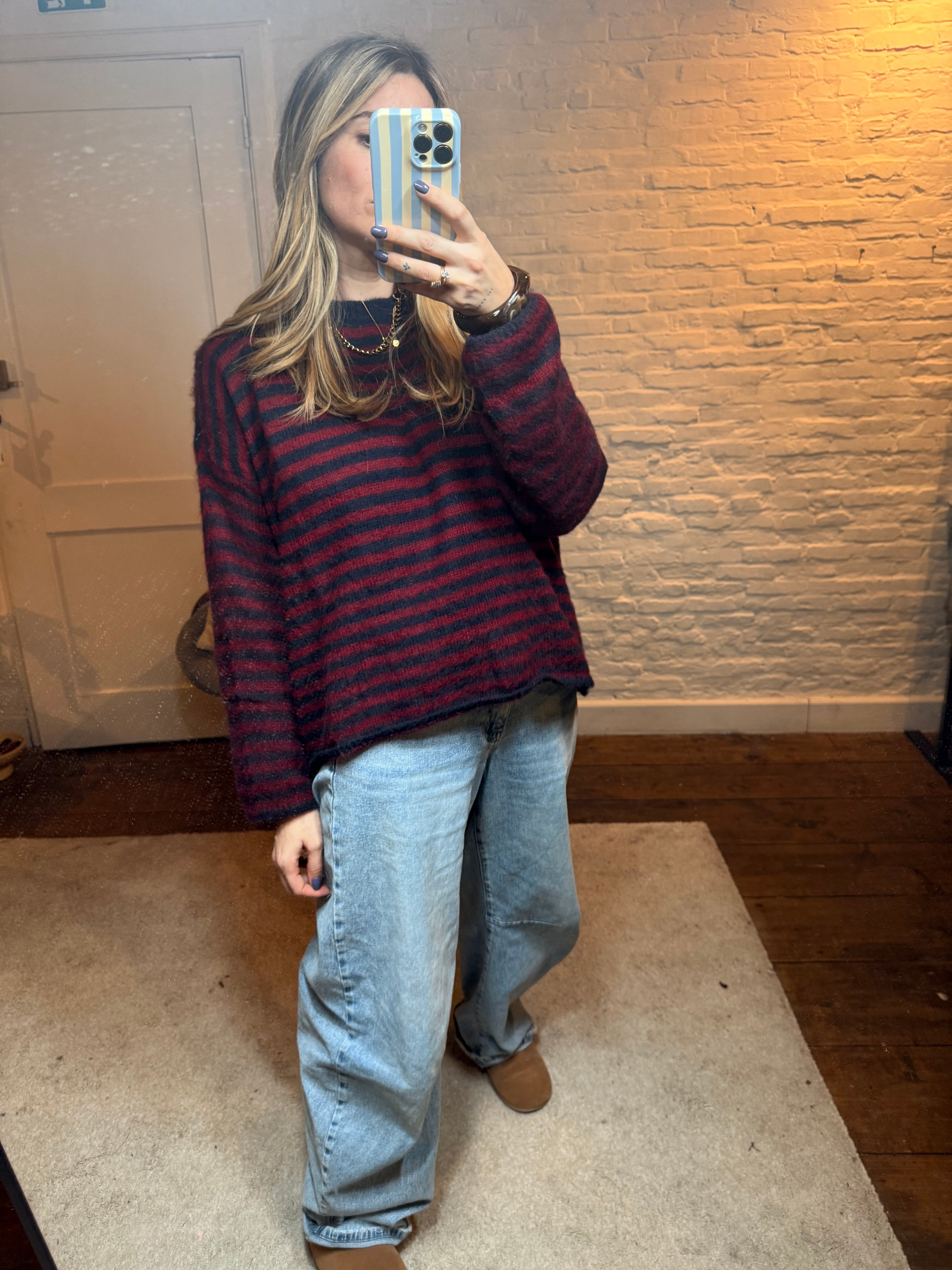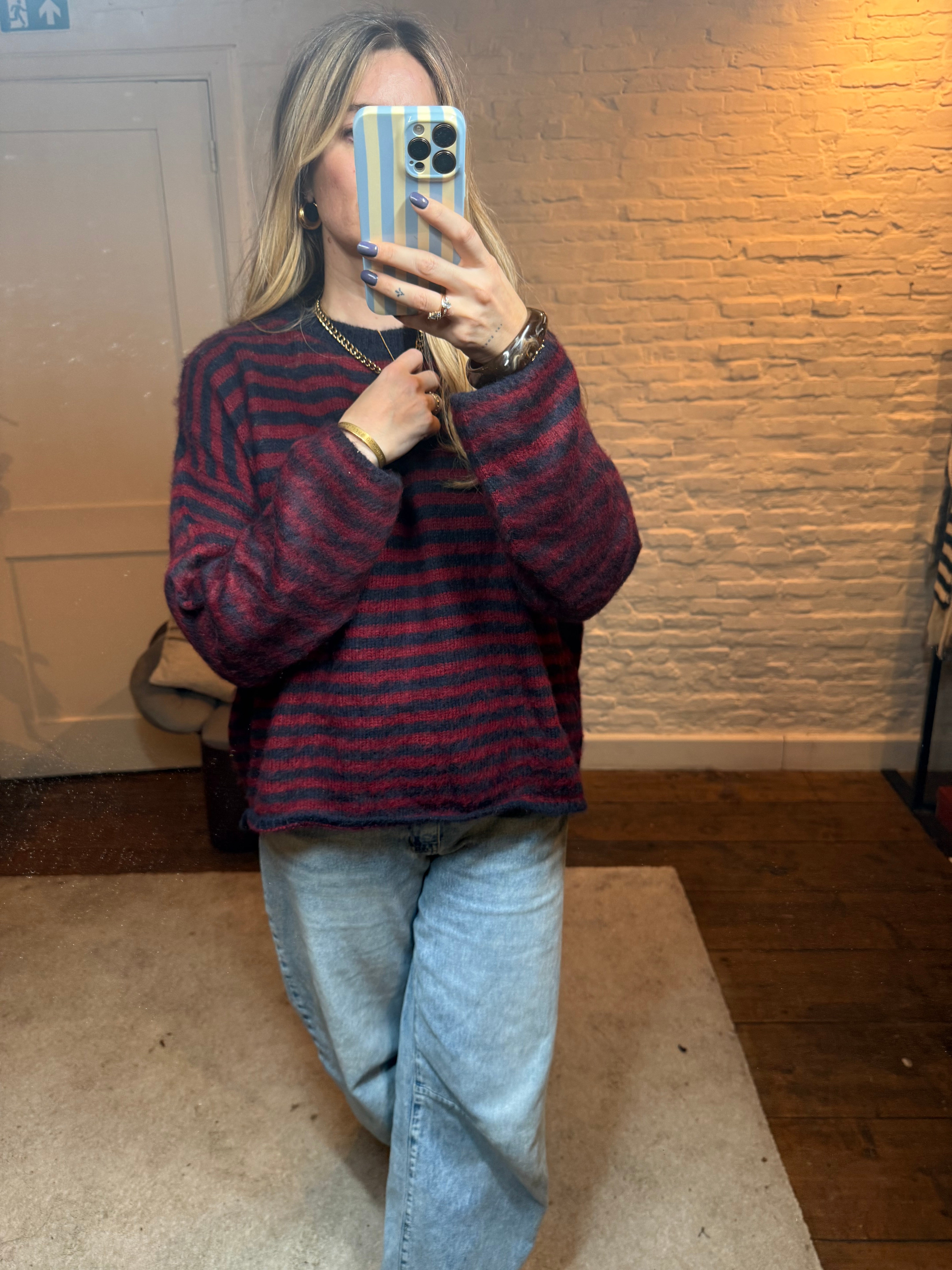 De fit is comfortabel en valt mooi soepel rond het lichaam, ideaal voor een casual, cozy look met net dat beetje extra dankzij de speelse strepen.