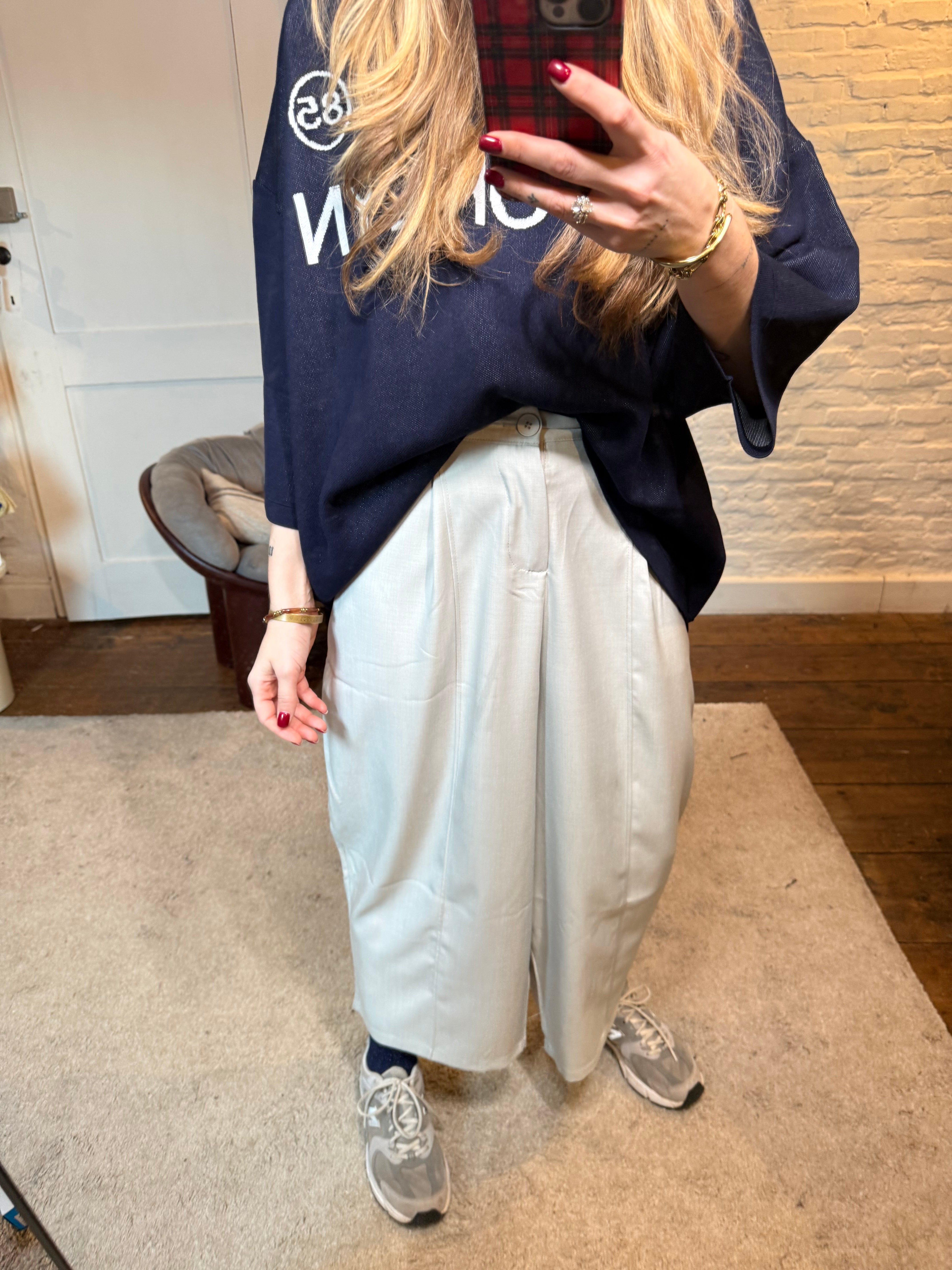 Dankzij het rekje in de rug zit hij extra comfortabel en past hij zich mooi aan de taille aan. Het model heeft een cropped/enkelhoge lengte, ideaal voor een trendy en luchtige look.